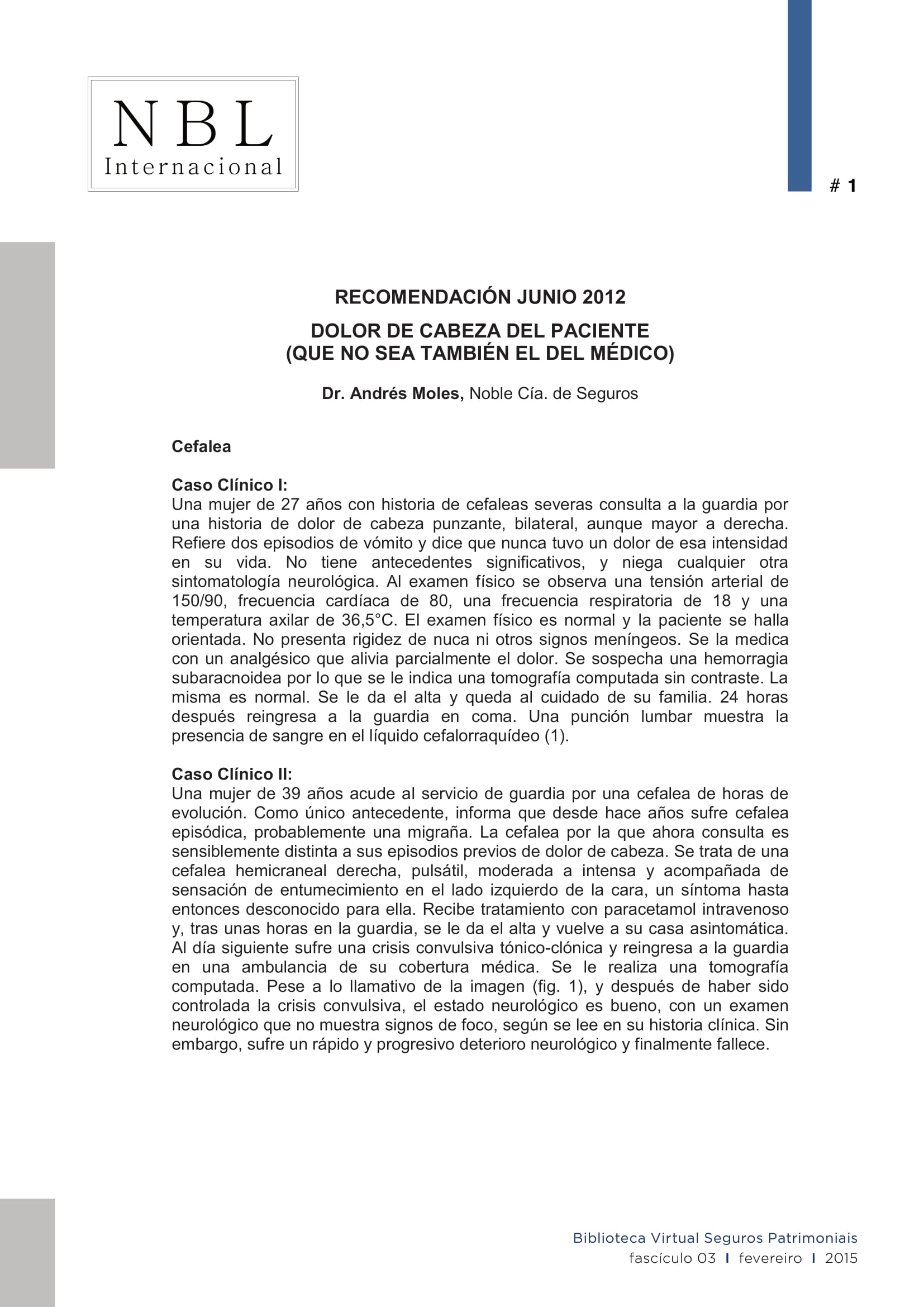 Al examen físico se observa una tensión arterial de 150/90, frecuencia cardíaca de 80, una frecuencia respiratoria de 18 y una temperatura axilar de 36,5°C. El examen físico es normal y la paciente se halla orientada. No presenta rigidez de nuca ni otros signos meníngeos. Se la medica con un analgésico que alivia parcialmente el dolor.