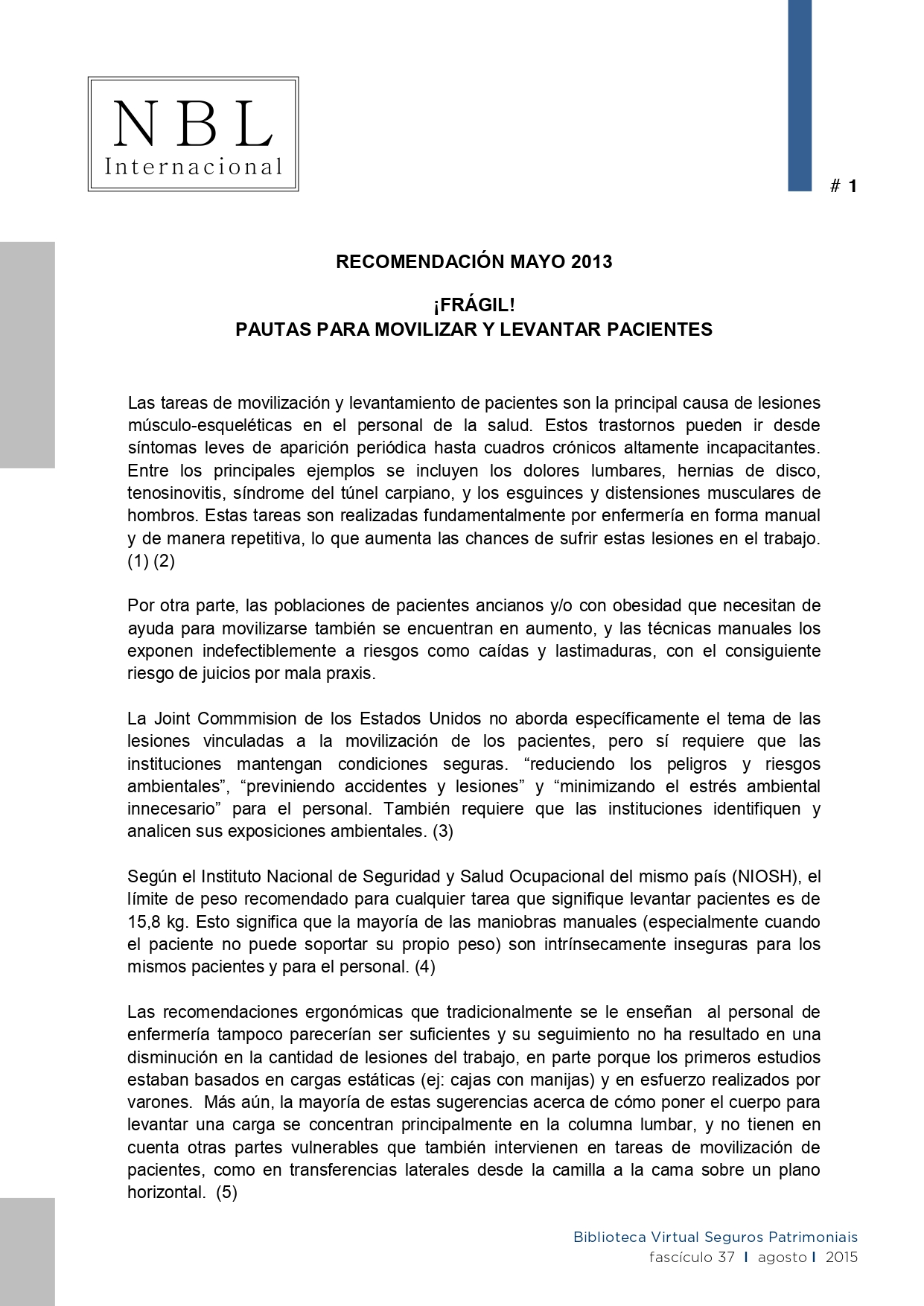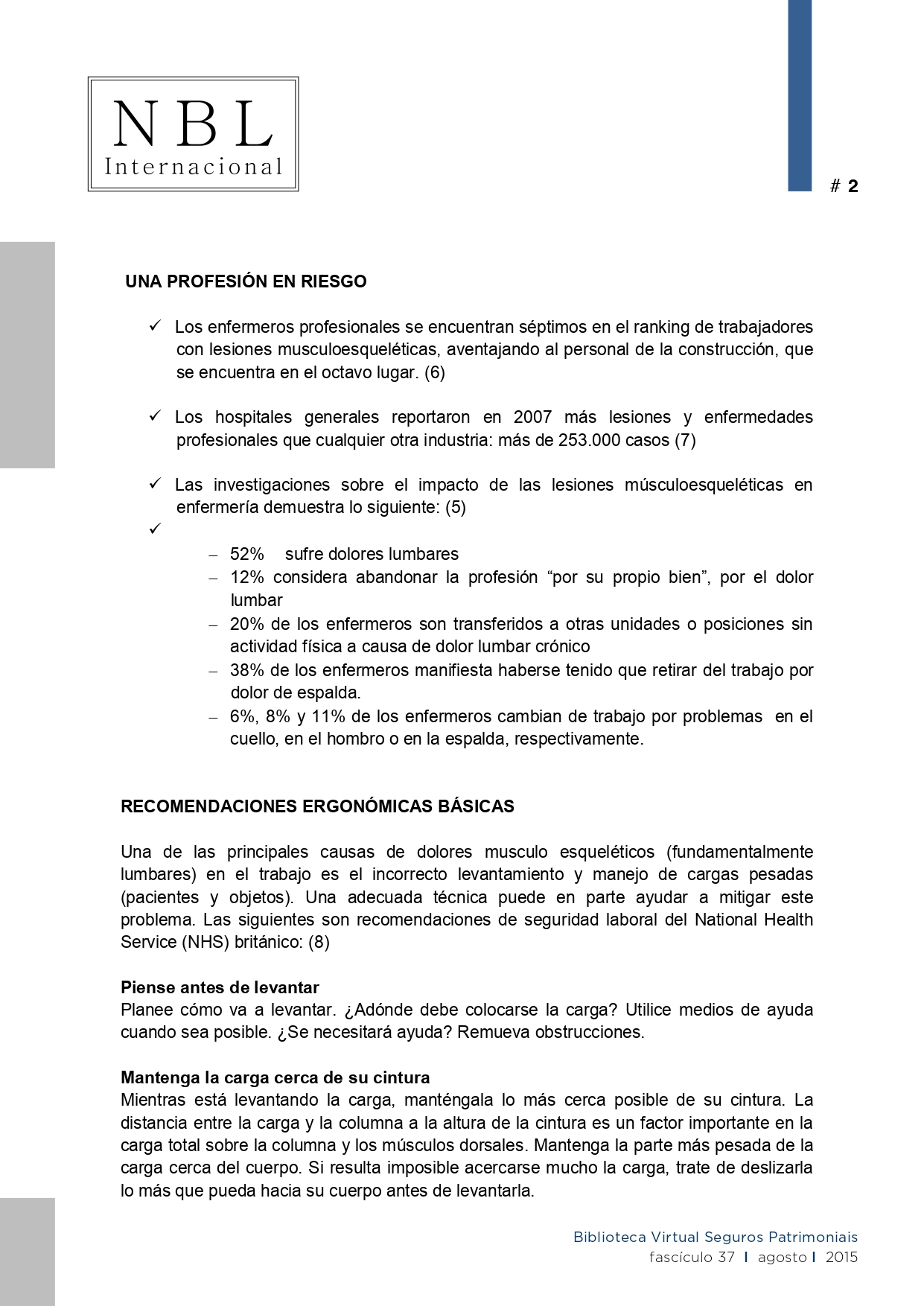 Las tareas de movilización y levantamiento de pacientes son la principal causa de lesiones músculo-esqueléticas en el personal de la salud. Estos trastornos pueden ir desde síntomas leves de aparición periódica hasta cuadros crónicos altamente incapacitantes.