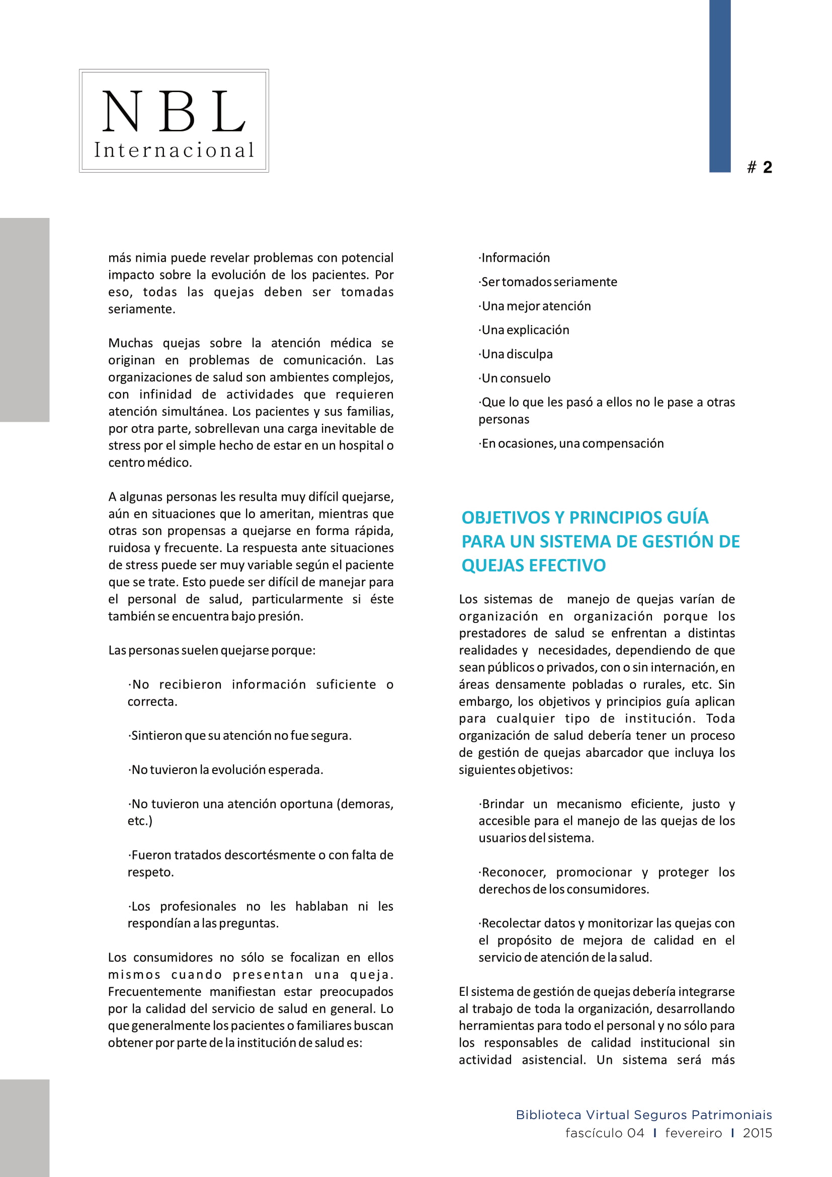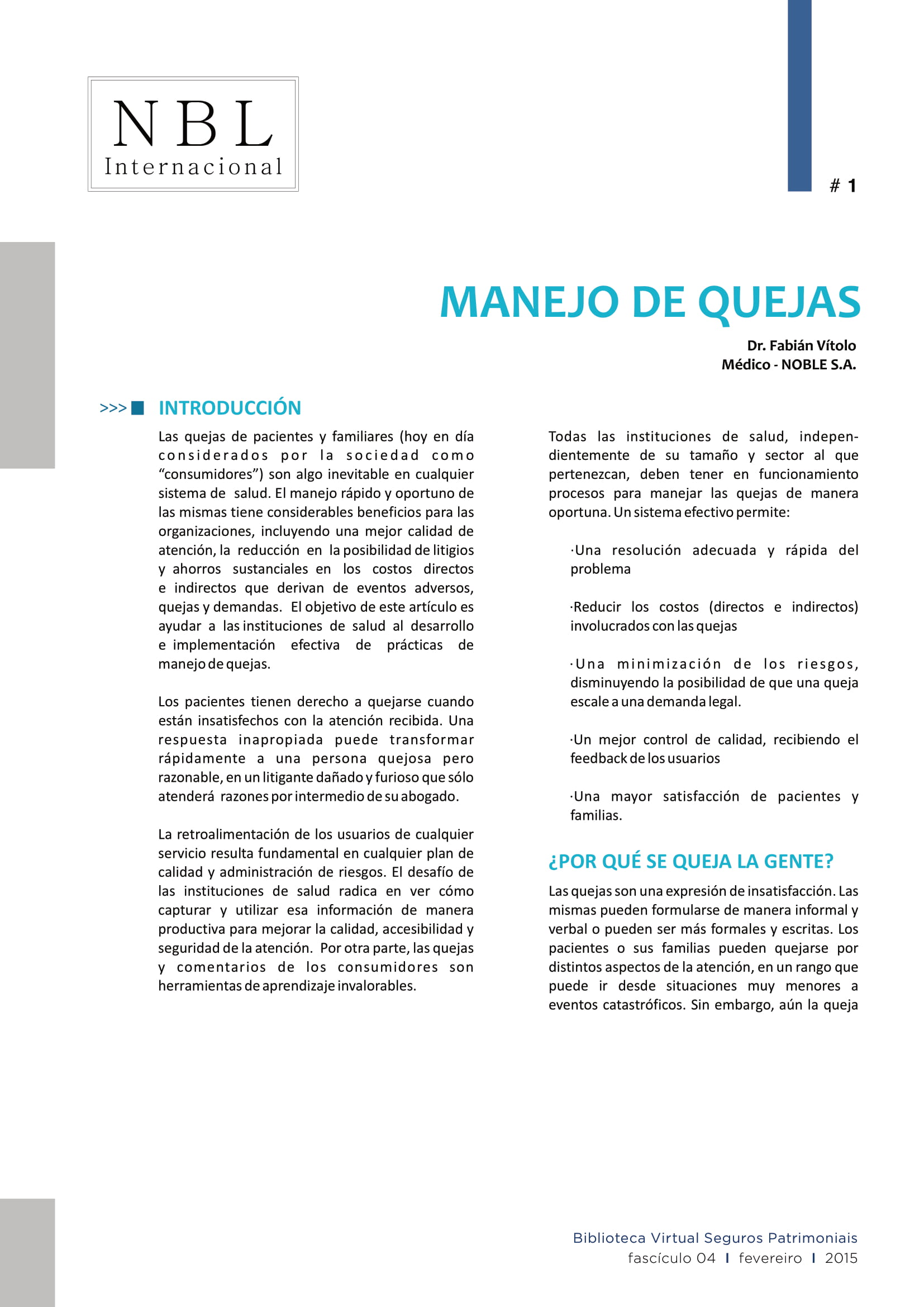 El manejo rápido y oportuno de procesos para manejar las quejas de manera las mismas tiene considerables beneficios para las oportuna. Un sistema efectivo permite: organizaciones, incluyendo una mejor calidad de atención, la reducción en la posibilidad de litigios ·Una resolución adecuada y rápida del y ahorros sustanciales en los costos directos problema e indirectos que derivan de eventos adversos, quejas y demandas. El objetivo de este artículo es ·Reducir los costos (directos e indirectos) ayudar a las instituciones de salud al desarrollo involucrados con las queja e implementación efectiva de prácticas de manejo de quejas.