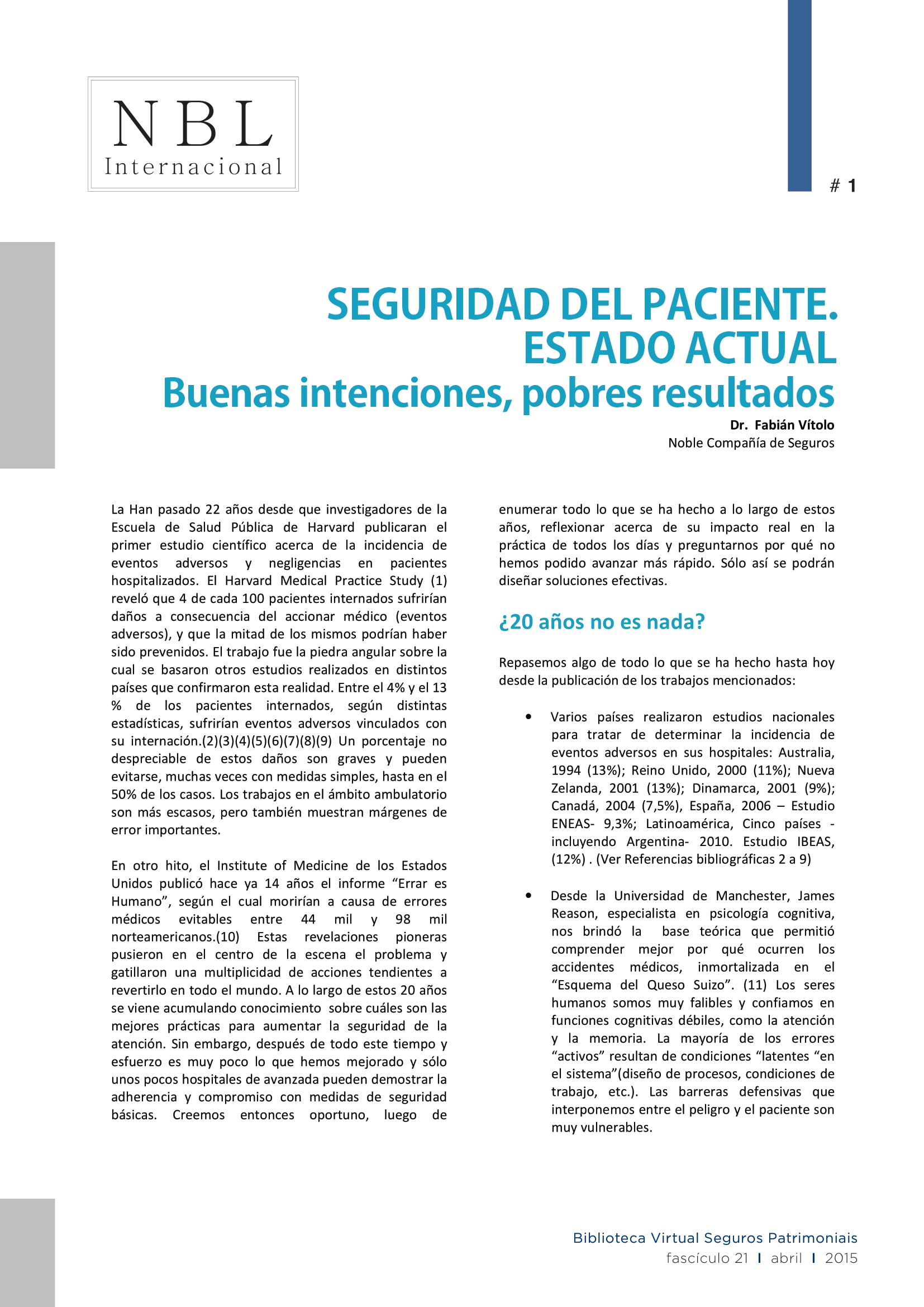 La Han pasado 22 años desde que investigadores de la Escuela de Salud Pública de Harvard publicaran el primer estudio científico acerca de la incidencia de eventos adversos y negligencias en pacientes hospitalizados.
